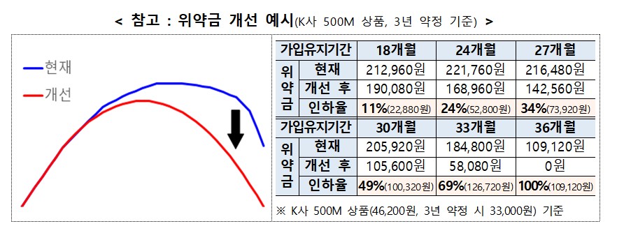 K사 500M 상품 기준, 22.2만 원(24개월 차) 19.0만 원(18개월 차)으로 3.2만 원(14.3%) 감소 K사 500M 상품 기준, 30개월 차 위약금 20.6만 원 10.6만 원(49%), 36개월 차 위약금 10.9만 원 0원(100%)
