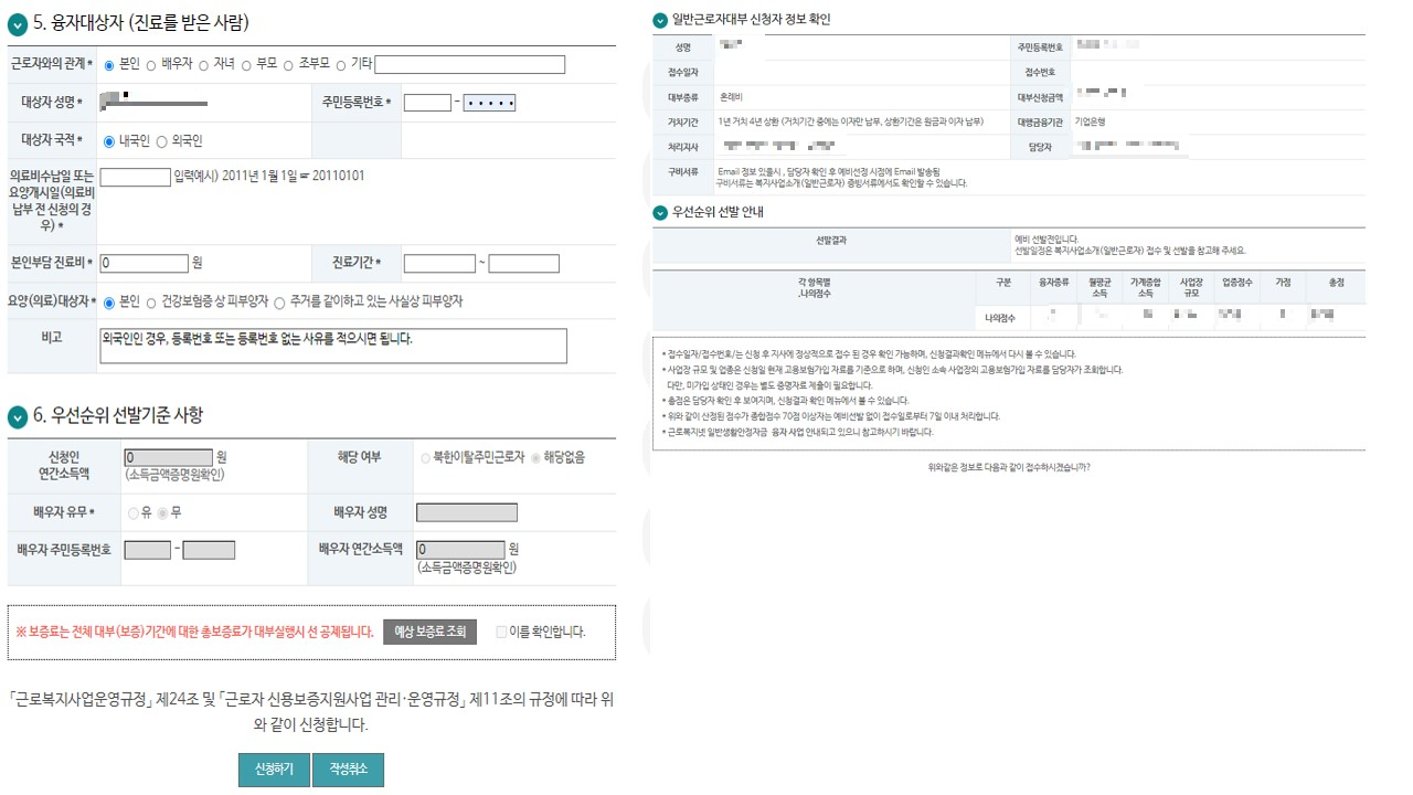 그다음은 융자대상자 즉 대출을 받는 사람의 성명을 적고, 우선순위 선발기준 사항에 해당됨에 따라 해당사항에 맞게 작성해 주시면 됩니다. 신청이 되면 일반근로자대부 신청자 정보 확인 페이지가 뜨고 접수일자와 대부 종류, 내가 선택한 거치기간과 처리지사 접수번호 내가 신청한 대부금액 담당자가 선정되어 있습니다.