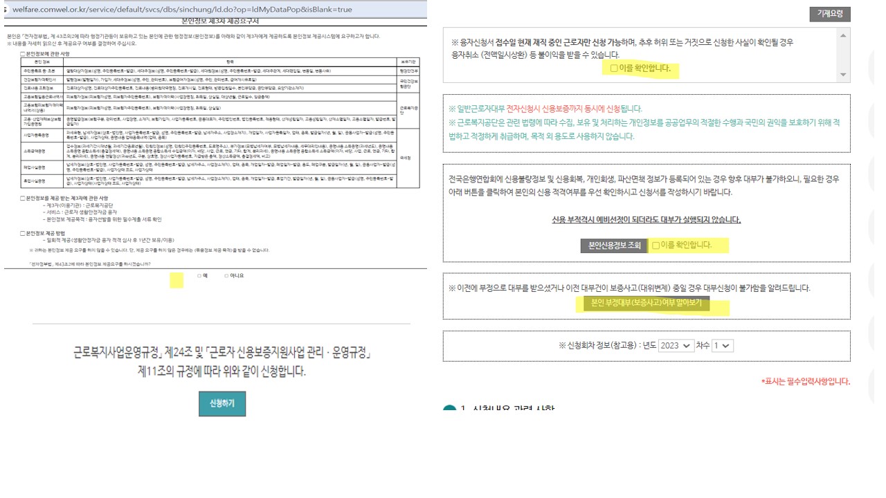 일반 근로자대부 전자신청 시 신용보증까지 동시에 신청됩니다 신용부적격시 예비선정이 되더라도 대부가 실행되지 않습니다. 본인신용정보조회를 실행하시고 이를 확인합니다를 체크해 줍니다.