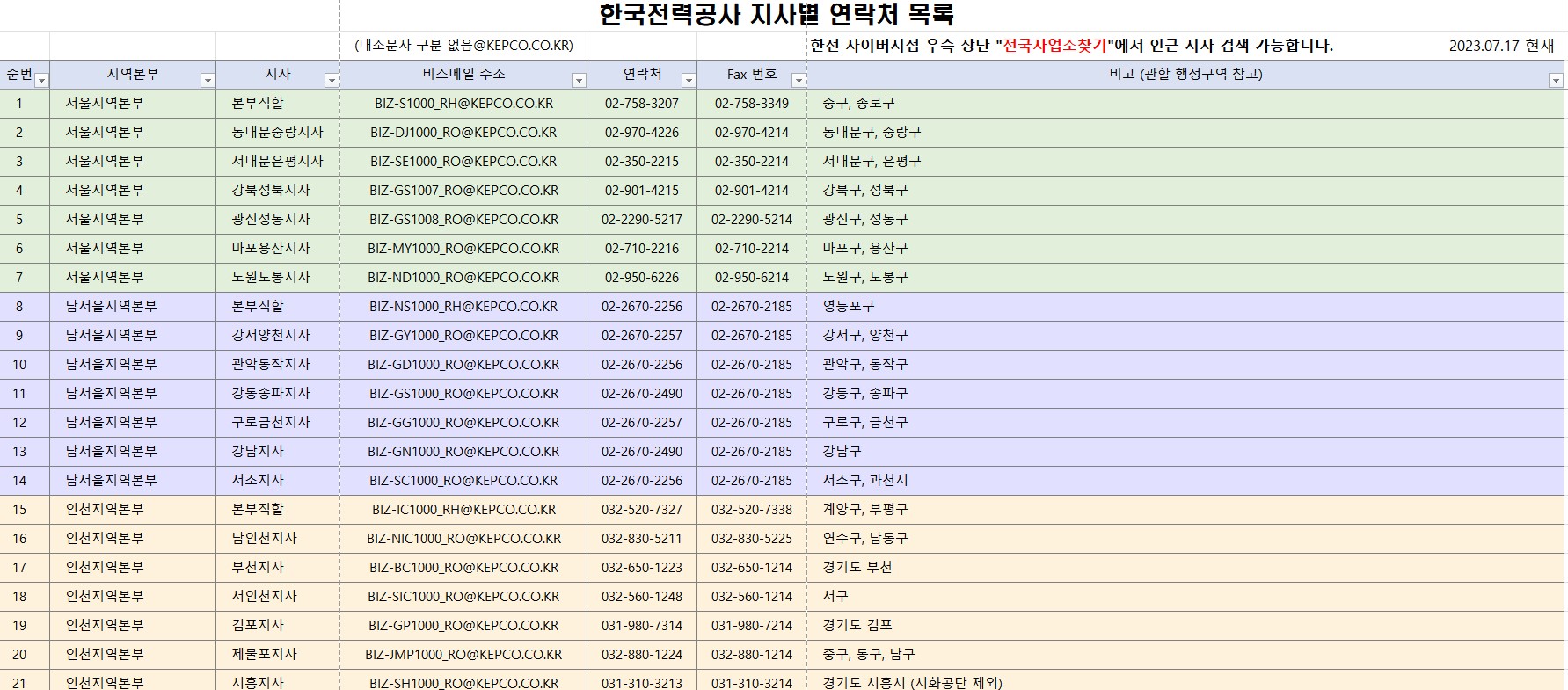 소상공인 소재지별 관할 한전지사 연락처(붙임 3)