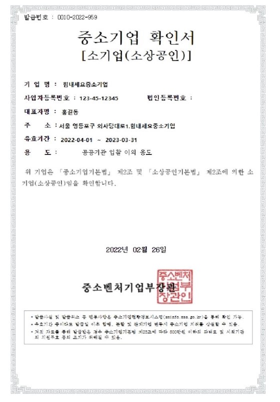 중소벤처기업부에서 발급한, 지원신청일 현재 유효기간 만료 전인 확인서만 인정